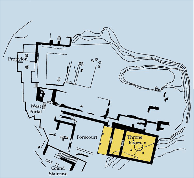 FIGURA A. Planta de palacio minoico. Complejo arquitectónico característico de la isla de Creta a lo largo del Bronce Medio (entre 1900-1450 a.e.). Se conocen bastante bien varios de estos palacios en Cnossos, Malia, Festo y Zacro, principalmente.