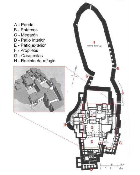 FIGURA B. Planta de ciudadela fortificada con palacio micénico (Grecia continental, Heládico Reciente o Período Micénico, ca. 1450-1200 [Fortalezas micénicas y tumbas de cámara y tipo tholoi]