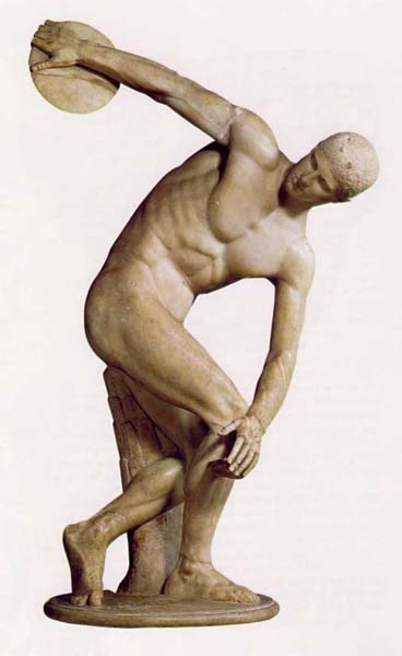 El estilo severo alcanza cotas de pericia técnica avanzadas en obras como el Discóbolo de Mirón (original en bronce, 460 a.e.), en el que el impulso del atleta se refleja en la tensión muscular y su equilibrio se sustenta en un movimiento fugaz, congelado en el tiempo. Esta obra adelanta muchos aspectos del siguiente período, pero arrastra aspectos muy marcados de la escultura de su tiempo, como la inexpresividad del rostro, el tratamiento del cabello (pegado al cráneo) o la perspectiva frontal de la imagen, todavía lejos de la tridimensionalidad que veremos en el período siguiente. En todo caso, esta obra nos está anunciando la inminente llegada de ese nuevo estilo.