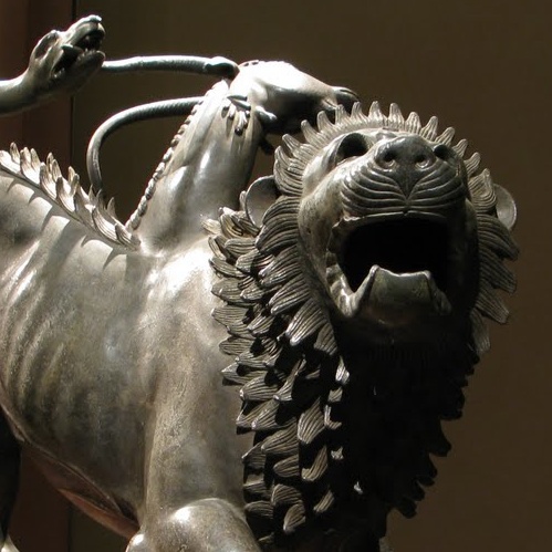 Quimera de Arezzo, siglo IV a. C., bronce. Descubierta en Arezzo (Italia). Ejemplo destacado de escultura etrusca en bronce realizada mediante fundición a la cera perdida, que combina influencias griegas con gran expresividad dramática.