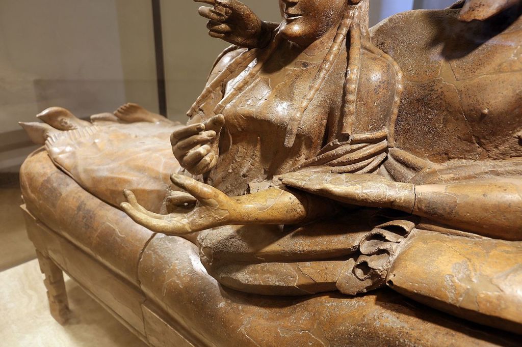 Detalle del Sarcófago de los esposos, ca. 520 a. C., terracota policromada, necrópolis de Cerveteri (Italia). Museo Nacional Etrusco de Villa Giulia (Roma). Representa a una pareja reclinada en un banquete funerario, reflejo de la concepción etrusca del más allá como continuidad de la vida.